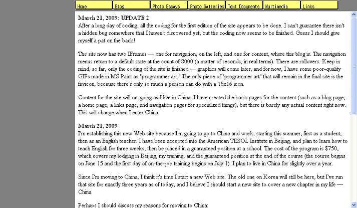 Content for the site will on-going as I live in China. I have created the basic pages for the content (such as a blog page, a home page, a links page, and navigation pages for specialized things), but there is barely any actual content right now. This will change when I enter China.