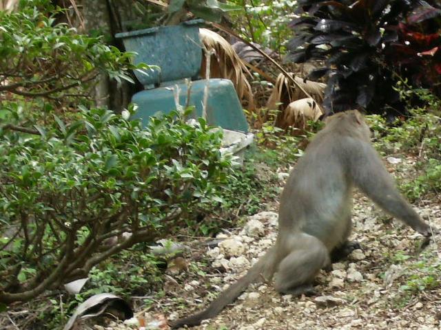 I saw an elderly couple sitting inside of a rustic bamboo enclosure surrounded by palm fronds that looked out into the jungle like something from Tarzan. I asked the couple about the monkeys, and they said that there were many monkeys, and at that very instant, right behind them...