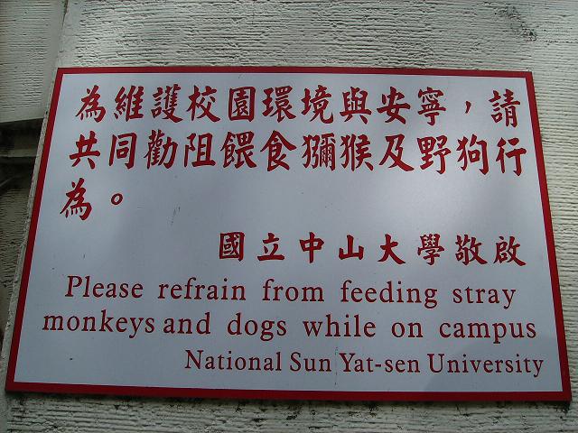 In late April, I made a goal to see a monkey in the wild. Not at a zoo. In the wild. The reasons for this were threefold. First of all, since I was a young boy, I have been fascinated by animals and nature, especially animals that I couldn't find around my Fairfax, Virginia home. My preschool teacher will tell you (if she still remembers) that I drew snakes all the time. The second reason for me wanting to find monkeys was that I am currently studying psychology for the UExcel Psychology exam, and every few pages of my textbook, it seems, they talk about experiments on monkeys. Experiments with monkeys being raised in solitary confinement. Experiments in which the monkeys are rewarded for solving complex puzzles by opening a window and showing them an “interesting scene” (like a model locomotive going past in an adjacent room). The ability of non-human primates to use language. Thirdly, my students here in Taiwan always talk about monkeys. Small children will laugh when an English teacher says “supermarket” because they think he said “supermonkey.” Students tell tales of monkey attacks, food-pilfering monkeys, etc. One student of mine claimed to have witnessed one that was “ 60 centimeters tall, the king of the monkeys.” That night, I decided to go and find monkeys on Shoushan, a local mountain. Between 1:00 and 2:00 AM, I hunted high and low — I called “here, monkey monkey!” I pretended to chew on my camera, making loud eating noises and exclaimed “mmmmm, this is delicious.” I removed my backpack, placed it on the ground as an “offering,” and walked perhaps 20 feet away. None of this worked. As the man at the top of Shoushan (who was chewing betel nuts) told me, the monkeys were sleeping and the best time of day to see them would be around 3:00 in the afternoon, all the way from Zhongshan University to Chaishan (there are apparently also many monkeys inside the nearby military base, a piece of information that was completely useless to me). The Chinese word for “monkey,” by the way, is “hóuzi ( ).” Today (May 1, 2010) I re-entered the mountains. I entered at Zhongshan University (National Sun Yat-sen University, named after one of the founders of the Republic of China) and went towards Chaishan. I entered Chaishan, and saw furry mammals flying through the trees! Wow, only a few minutes in the woods, and I had already gotten lucky, right?