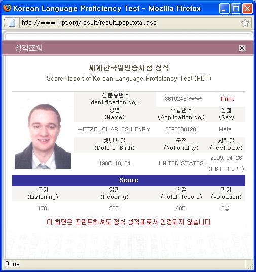 May 13, 2009: UPDATE 2 My associate's degree coursework is now definitely DONE.I feel like an absolute ball of pure, invincible energy. I have literally grabbed AT LEAST 30 credit hours THIS SEMESTER (not counting the NYU Korean test, which may add up to 16 credit hours to that number). SO IN THEORY, I MAY HAVE GOTTEN AS MANY AS 46 CREDIT HOURS IN THE SPRING '09 SEMESTER.Understandably, I'm proud. Now all I have to do is file some basic forms and papers for my graduation. Then I can re-enroll and worry about my bachelor's degree (while making nice money as an English teacher with a valid visa). May 13, 2009 May 12, 2009 This means that I am now basically completely certain of 56 credit hours (60 needed to graduate), think I might have about 10+ on the way from the NYU Korean test, and I'm taking a four-credit C++ test tomorrow. So at this point, unless I really bombed the NYU test, I've basically met all the requirements to graduate. Tomorrow's test is the C++ Programming for Game Developers - Module I test. I expect it to be HARD. Both the midterm and the final (which were actually just practice exams, since the entire course grade is overridden by the final) were really tough and I got in the low 70s (70 is the cutoff for passing). So I'm kind of anxious about it. Tonight I plan to study the harder units (two hard units remain) and then quickly review the easy units tomorrow morning and afternoon. If I do this, I think I should have a reasonable chance at a 70% or higher (passing). If I fail tomorrow's test, I'd say there's still a roughly 75% chance that I'll graduate (since the NYU test scores will probably come through for me). If I pass tomorrow's test, the chances rise to maybe 90%. As long as I get my associate's, this is a HUGE step forward. An associate's degree is the minimal qualification to teach in most of developed Asia. Korea, Taiwan, and several more developed Chinese cities and provinces all set an associate's as the minimum qualification for a teaching visa. Although Japan generally requires a bachelor's degree, I have heard anecdotally that occasionally Japan also accepts an associate's instead if you are an exceptional case (I heard about one associate's degree holder who got a working visa for Japan because the immigration officers really wanted to give that person a visa, and slightly bent the regulations and counted five years of volunteer work at the Boy's and Girl's Club as "teaching experience" and issued the visa). In any event, making money here in Asia will be MUCH easier from July. I am ecstatic. May 10, 2009 So all in all, I got a fair deal done today. Tomorrow, I can get away with slightly less history reading, but should do significantly more C++ study. That's really what I should be worried about. May 9, 2009 Once again, I got all A's for the term at NOVA, although this doesn't mean much since I only took eight credit hours. My current NOVA GPA (based on 36 credit hours) is 3.778. Cruisin'! Only 35 of those 36 can be recognized at Excelsior College (Excelsior specifically excludes SDV 100 because it's only an orientation course). I have passed four CLEP exams so far (12 credit hours) and one AP exam (3 credit hours). So kids, 35 + 15 = 50. 50 credit hours. I need 60. This week, I have the following tests, which will add up to exactly 10 more credit hours: I should study lightly for the Social Sciences and History CLEP, and study HARD for the C++ test. The latter will be MUCH harder than the former, I'd imagine. According to my experience on the midterm and the final, assuming I were fresh out of the course (which I'm not), I'd get in the lows 70s, barely passing for transfer purposes. The course grade is based ENTIRELY on the final exam. This gives me four days to study for C++ (worried), and three days to study for CLEP Social Sciences and History (not worried). HOWEVER, in the extremely unlucky event that I fail the C++ test, or in the event that one of the transcripts doesn't make it to Excelsior College in time, NYU's test scores will probably come through. In theory, these could give me up to 16 credit hours in padding, just in case. In theory, as of the end of this month, my Excelsior College transcript could show 76 credit hours, although this is highly unlikely. Things seem to be going great with Yuri, by the way. She's like, the polar opposite of Chung-hee. It's really refreshing. For example, Chung-hee was always trying to hide my existence from her older brother, because he'd "kill us," but Yuri has already told her brother, who really wants to meet me and thinks it's cool Yuri and I are going out, because he's a big fan of America. May 8, 2009 Yep, Charles Wetzel and Yuri Choi are going out! Now, you're probably saying "Wait a minute, aren't you trying to get out of Korea? Why are you dating a Korean girl when you're leaving next month?" Well, I know, the timing sucks, but on the other hand, I think of it this way: Yuri Choi is 23 (about one year older than me), from Jeonju (famous for its bibimbap), works at a Japanese restaurant, wants to become a police officer, her favorite game genre is RPG, and her favorite movie genre is horror. We saw "Texas Chainsaw Massacre" last night. Disgusting movie in my opinion, but fascinating in a morbid way. Modeled on the serial killer Ed Gein, about whom I already knew. Yuri supports the death penalty. I've got to say, with horrible, bizarre murderers like Ed Gein, Franky (Germany), Yu Yeong-cheol, etc. I have to say I support it in certain cases, too. Didn't used to, but that changed when I was a senior in high school and heard about a grizzly murder that happened in Fairfax County (and Franky, the German cannibal). Anyways, back on topic. Got a girlfriend. She's gorgeous and seems to have a much more westernized, free-thinking style than Chung-hee, but how things will turn out, time can only tell. May 7, 2009 My actual goal for the end of the teaching stint in Taiwan (after one year in country) is very